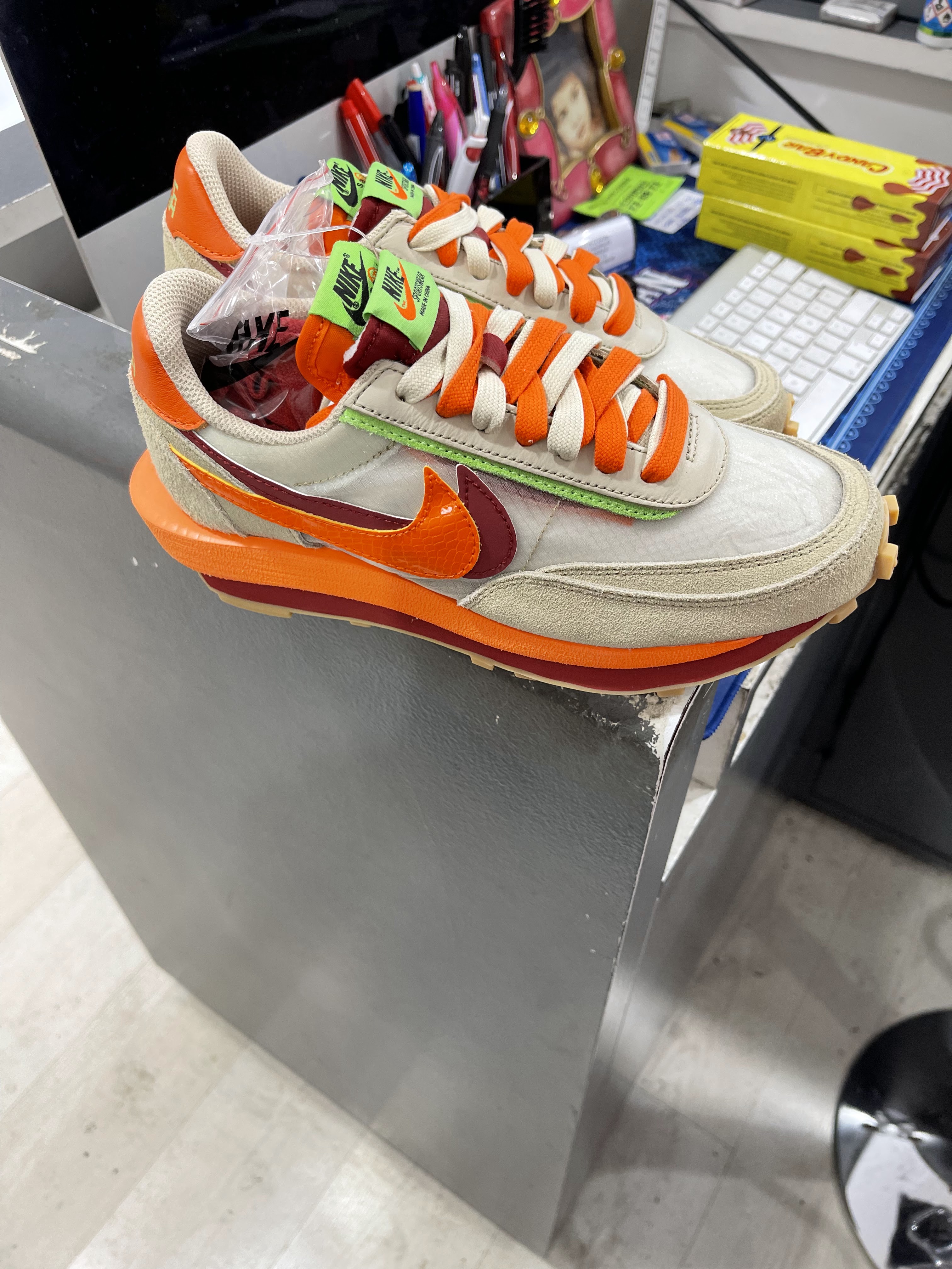 Alors déçu, même très déçu! Quand on compare les jordan 1 low fragment de chez Nike qui sortent chez snkrs et ce que vend cette boutique ça n’a rien à voir au niveau des coutures, des détailles et de la couleur de la chaussure et même la position de certaines écritures. Comme les Jordan 1 Mocha qui viennent de sortir à 60 000 exemplaires, j’ai eu la chance d’en obtenir une à sa date de sortie et le tissu n’a rien à voir avec celle présentée de cette boutique. Les vendeuses sont sympathiques, mais rien de plus.